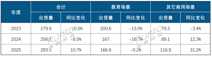 字据洛图科技(RUNTO)数据露馅,2025年,中国市集出货量为78.8万台,同比着落2.2%;出货额为53.6亿元,同比着落9.3%。