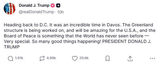 “正返回华盛顿,达沃斯时间精彩绝伦,”特朗普美东时间下午13点35分发帖,自我肯定,“格陵兰框架正在推进,将对美国非常棒,‘和平委员会’是世界前所未见的东西——非常特别。太多好事在发生!”