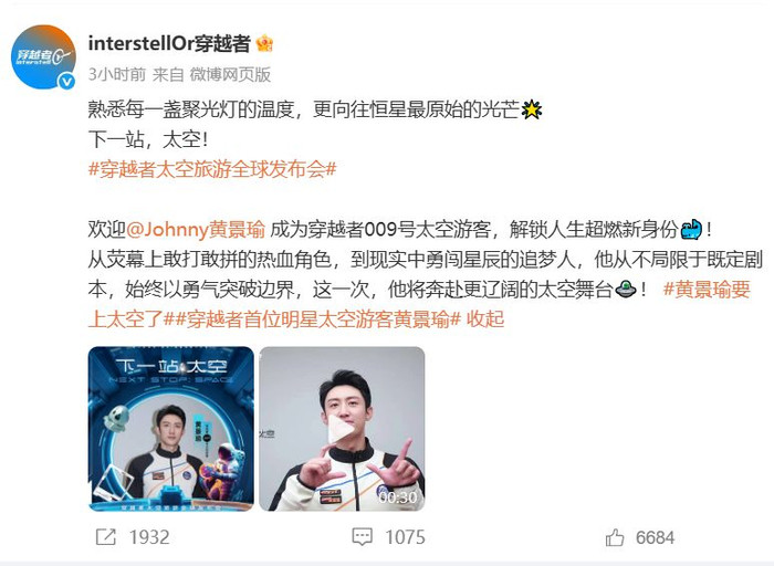 1月22日,@interstellOr穿越者官宣@Johnny黄景瑜成为009号太空游客,黄景瑜在vcr中表示很荣幸成为一名太空旅客,将乘坐中国人自己的飞船亲身抵达那片星海。