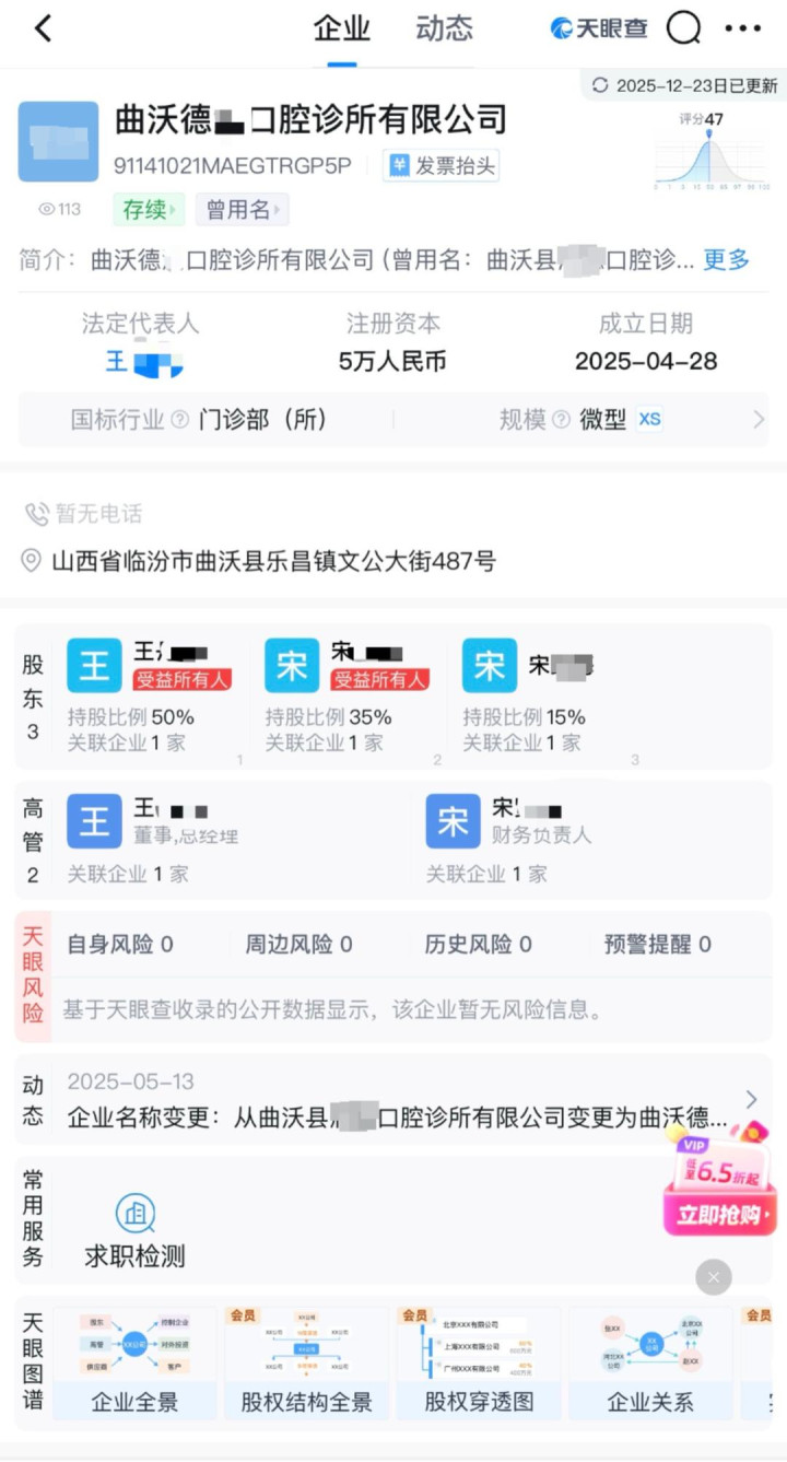 天眼查信息显示,曲沃德X口腔诊所有限公司成立于2025年4月,注册地址为曲沃县乐昌镇文公大街487号,而曲沃宋X荣口腔注册地址为曲沃县乐昌镇文公大街工商局东50米,两者步行距离为130米左右。
