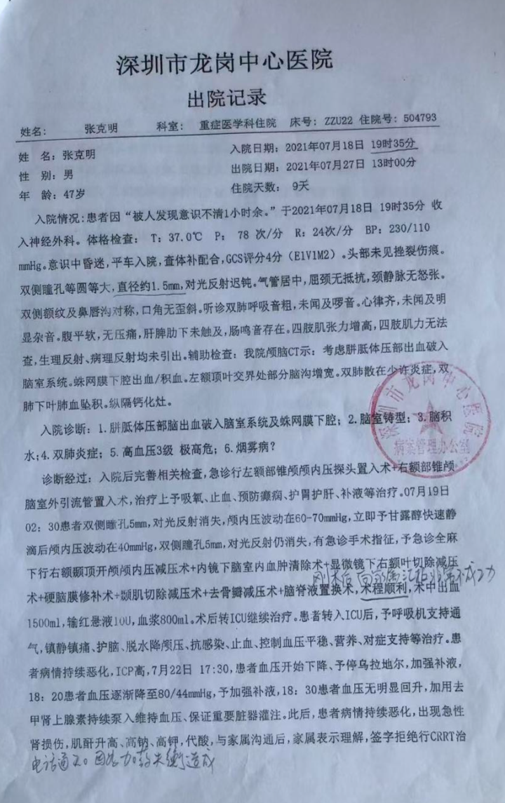 医院就诊记录显示,入院时,其双侧瞳孔缩小,对光反射迟钝,诊断为脑出血、极高危高血压等。紧急手术后,其瞳孔持续散大,对光反射消失。临床上,这通常是判定脑死亡的佐证之一。