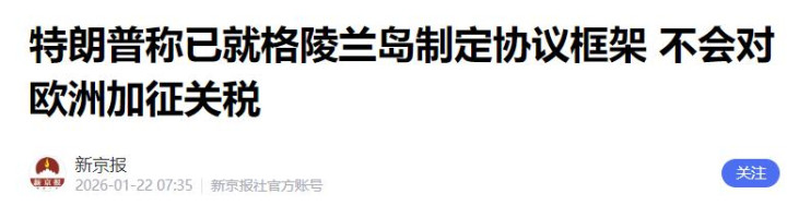 先是称自己刚和北约秘书长吕特进行了“愉快会晤”,双方就格陵兰岛问题沟通顺畅,随后话锋一转,宣布原定于2月1日生效的对欧关税不再实施。从信誓旦旦的“百分百落地”到突如其来的“紧急叫停”,不过48小时就完成了态度大转弯。