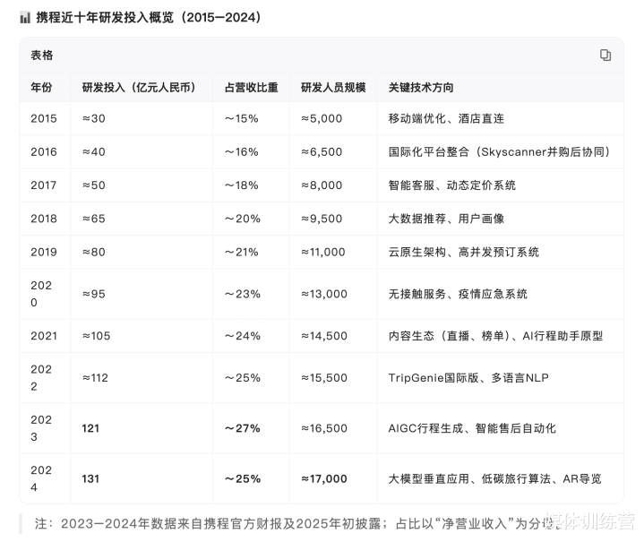 过去十年,携程在技术方面的投入在绝对值、营收占比方面都逐年提高,金额从2015年的30亿元从2024年的131亿元,研发人员从2015年的5000人扩充至目前的17000人,研发营收占比从2015年的15%增加至2024年的25%。