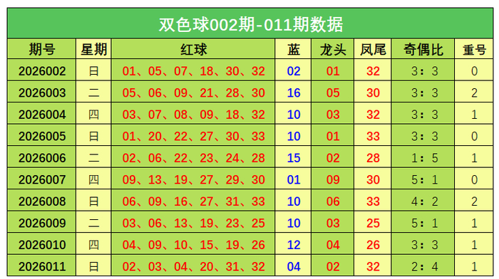 双色球第2026011期开奖奖号:红球02、03、04、20、31、32,蓝球04。龙头02,凤尾32,奇偶比2:4,开出1枚重号。