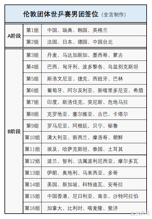 注:中、法是男团排名最高的协会,因此不用抽签直接确定位置,其余排名相近的球队相互回避,不会被分在同一组。