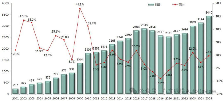 图表1:2001-2025年中国汽车销量走势