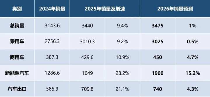 在公布2025年产销数据的同时,中国汽车工业协会还对2026年汽车市场进行了预测。据预计,2026年国产汽车总销量预计将达到3475万辆,微增1%。其中,乘用车预计为3025万辆,微增0.5%;商用车预计为450万辆,小幅增长4.7%;新能源汽车预计为1900万辆,增长15.2%;汽车出口量预计为740万辆,小幅增长4.3%。(见图表5)