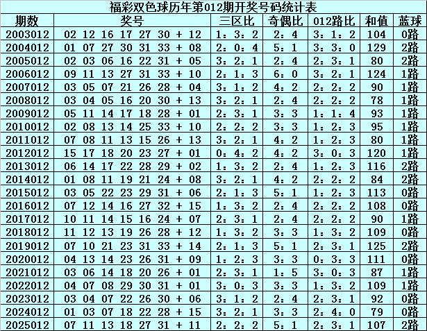 在第012期历史同期奖号中,红球三区分布总比例为47:46:45,奇偶总比例为75:63,012路比为42:50:46,和值分布在78-129之间,蓝球号码012路总比例为7:10:6。