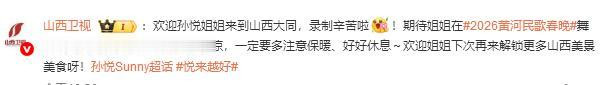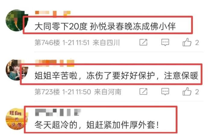 从她发出的照片中可以看到,孙悦满脸通红,特别是眼圈、脸颊部分呈现出粉红色。不少网友留言“大同春晚录制辛苦,姐姐务必做好保暖措施”“心疼姐姐冻到,录节目也要把保暖放在心上”。