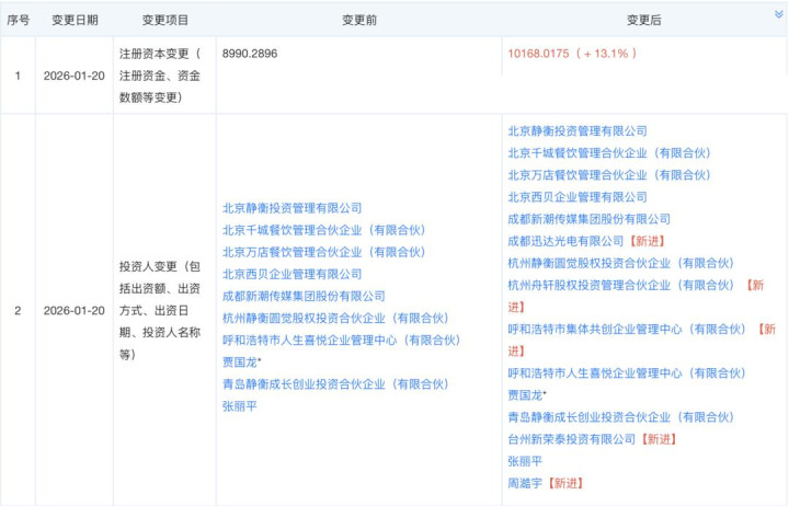 同时,西贝餐饮的注册资本由8990.2896万元增至10168.0175万元,增幅达13.10%。