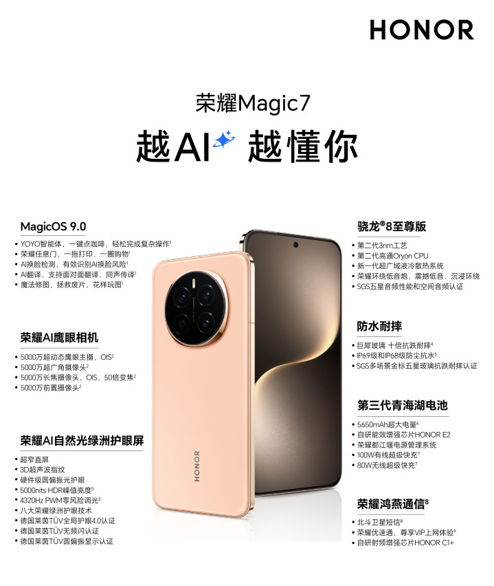 名规律四的是荣耀Magic8,12GB+256GB版国补价3676元,16GB+512GB国补价为4274元,中枢卖点是超夜神影像系统。该机搭载骁龙8Elite Gen5旗舰芯片,经受6.58英寸旗舰护眼中屏,机身内置7000毫安时电板,援救90W+80W双重闪充,仅有7.95毫米和205克。后置5000万+5000万+6400万潜望式长焦三摄组合,最高援救3X光学变焦和100X数码变焦,耐用性上有晶盾玻璃和满级防水,1TB版块援救北斗卫星通讯功能。