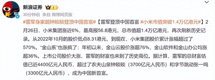 说到小米,大家都知道之前小米汽车出来之后,小米的股价那是一路飙升。记得那个时候,因为股价上涨,雷军还超越了钟睒睒,成为了中国首富。记得那个时候,小米股价报价是56.8港元,总市值超过了1.4万亿港元。那个时候,雷军总财富估算是4400亿人民币,是真正的中国新首富。