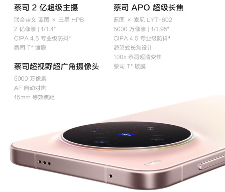 小米17后置5000万像素 光影猎东谈主 950 高动态主摄+5000万像素超广角+5000万像素耸峙长焦的组合,友商的vivo X300,则是2亿像素三星HPB主摄+5000万像素超广角+5000万像素索尼LYT-602潜望长焦。