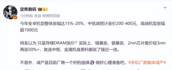 本年安卓机型合座涨幅达15%-20%,中低端瞻望加价200-400元,高端机型涨幅超1000元。