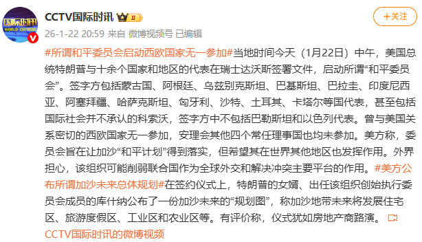 据CCTV国际时讯微博消息,当地时间1月22日中午,美国总统特朗普与十余个国家和地区的代表在瑞士达沃斯签署文件,启动所谓“和平委员会”。