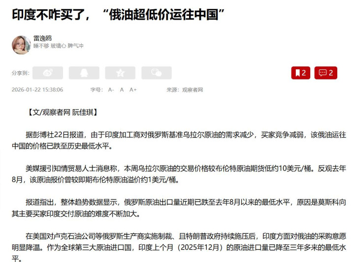 这其中的原因在于,俄罗斯十分希望出手这些印度不要的原油,正在和中国买家谈价钱。最终,俄罗斯方面给出了大幅折扣。若不向中国出口,俄罗斯的原油根本卖不出去。