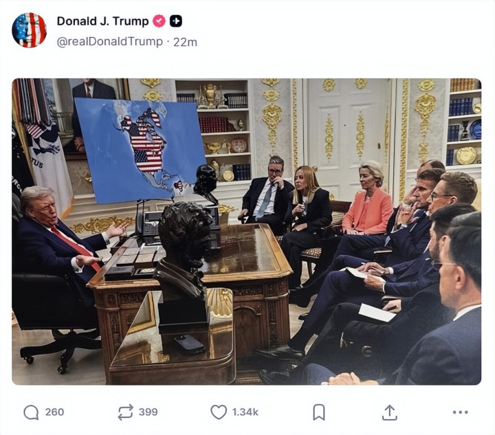 原图是去年8月份,7个欧洲国家和组织的领导人陪着乌克兰总统泽连斯基访问白宫时拍的,当时特朗普手边放的是乌克兰局势地图,跟北美洲半毛钱关系没有。