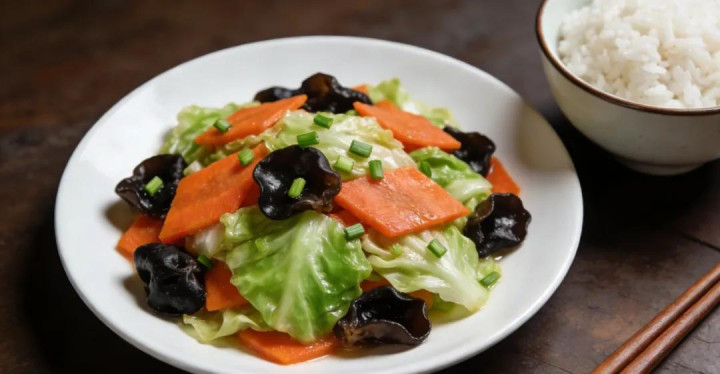 木耳泡发后撕成小朵,与胡萝卜、白菜大火快炒2分钟,加少量盐、生抽调味即可。