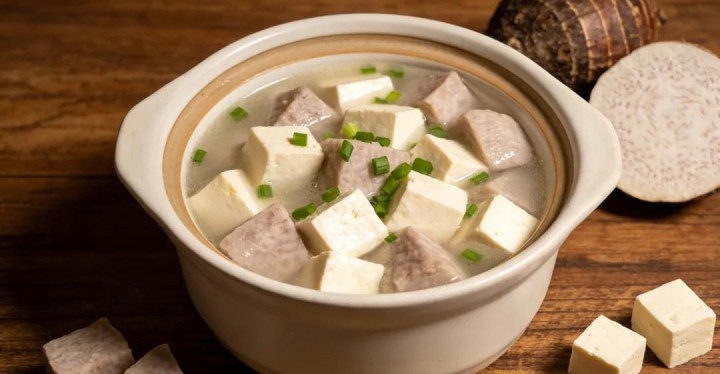 是温润祛湿的碱性汤品典范。芋头性平味甘,富含黏液蛋白,属于碱性食材,能健脾止泻、化痰祛湿,对脾胃虚弱、湿气重导致的腹胀有很好的调理作用;