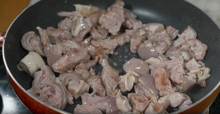6、起锅,加入少许的食用油,油热后,倒入羊肉,开大火不停地翻炒,尽量多炒一会,这样吃起来才更香,大概煸炒2分钟左右,把里面的水分全部炒干。