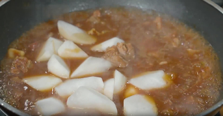 9、时间到了之后,羊肉也炖至8成熟了,将里面的葱姜、辣椒等配料挑出来,然后倒入萝卜块,继续盖上盖子,开中小火炖15分钟。