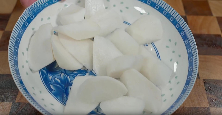 4、做这一道炖羊肉,我喜欢往里面加一点白萝卜,准备一根白萝卜,给它洗净去皮后,给它切成滚刀块,全部切好后,装入盘子中备用。