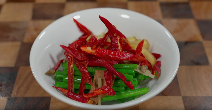 5、接下来准备一块洗干净的生姜,米兰app官网版给它切成薄片,再拿出几根小葱,用刀切成小段,最后准备一小块桂皮,还有一小把干海椒。