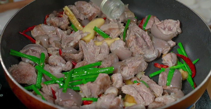 7、下一步倒入姜片、葱段、桂皮和干海椒,继续不停地翻炒,给它炒出食材的香味,然后倒入一点高度白酒,瞬间香味就上去了。