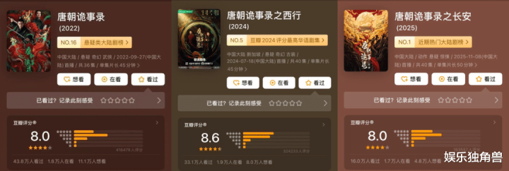 同样惊人的还有它的内容品相与市场买单度。如三部长剧豆瓣评分都达到了8分+,云合集均V30都达到了3000万+,《唐诡西行》和《唐诡长安》在爱奇艺站内热度破万,两部微短剧也先后打破爱奇艺站内热度记录……稳稳打破了系列化开发的续集口碑魔咒,“唐诡系列”也成为国产剧新标杆。