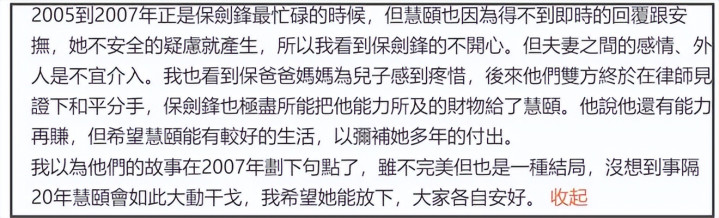 事情的源头,是保剑锋的前女友黄慧颐时隔 20 年的爆料。