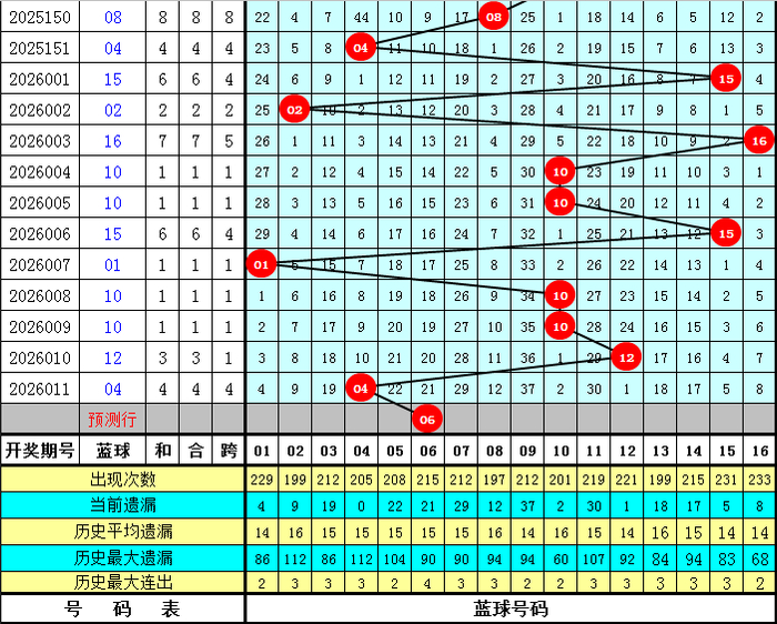 蓝球:上期蓝球号码为04,开出小 号、偶数,蓝球最近7期大小比为5:2,本期注意小 号蓝球出现,蓝球关注06。