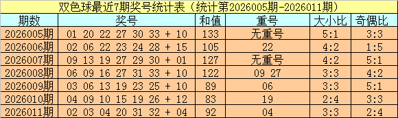 开奖回顾:双色球第2026011期奖号为:02 03 04 20 31 32 + 04,红球和值为92,奇偶比为2:4,大小比为3:3。蓝球开出偶数。