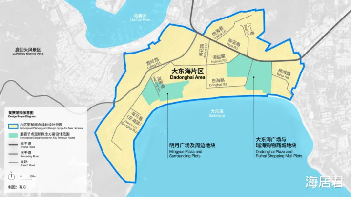 重要节点更新概念方案设计范围约15.52公顷,包括:①大东海广场与瑞海购物商城地块,用地面积约9.76公顷;②明月广场及周边地块,用地面积约5.76公顷。